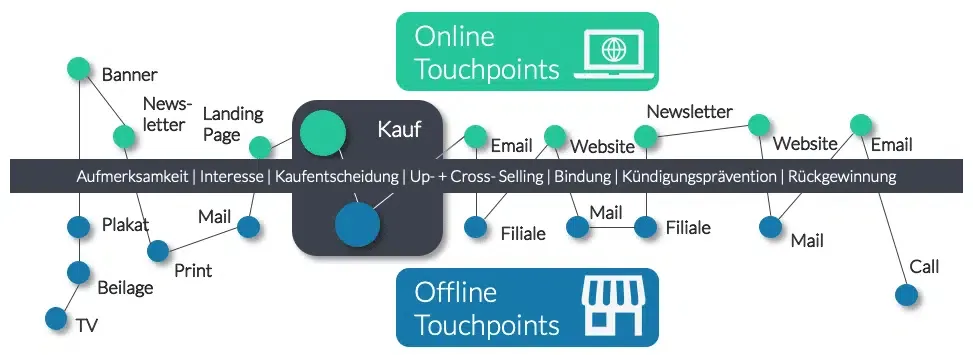 Die sogenannten „Touchpoints“ (Knotenpunkte) auf die dein potenzieller Kunde trifft, sind alle Arten von Werbung, Onlinemarketing-Maßnahmen und auch die Informationssammlung bei Freunden, in Onlineforen und an anderen Orten.